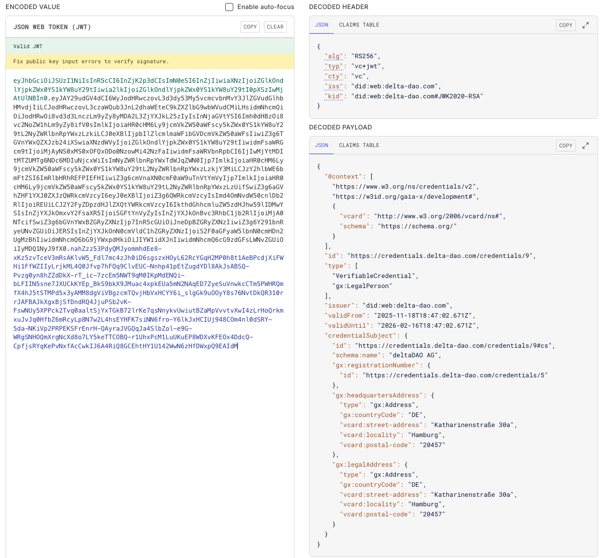 If you want to decode the JWT payloads of the Gaia-X Credentials to make them human-readable you can use any JWT Decoder, i.e., https://www.jwt.io/.