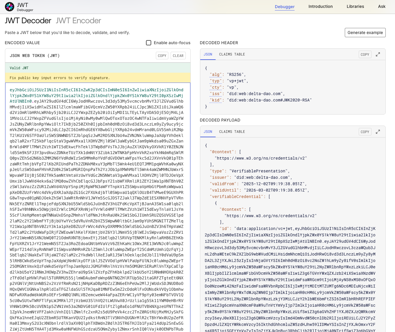 The Legal Person (LP), Issuer, and Legal Registration Number (LRN) Credentials, as individual Verifiable Credentials (VCs), can be decoded in a single step using a JWT decoder.