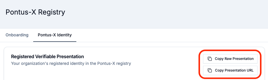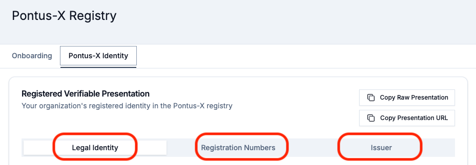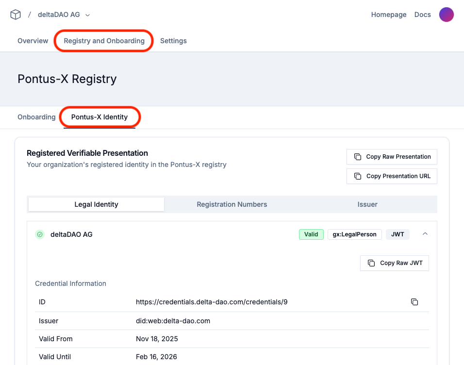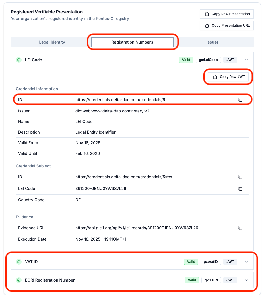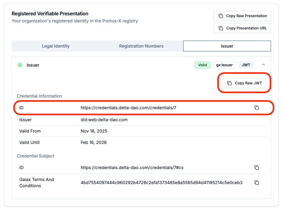 The complete Participant ID, in the form of a Gaia-X Participant Verifiable Presentation (VP), can be retrieved using the tabs "Legal Identity", "Registration Numbers", and "Issuer" at the very top. Use the the options "Copy Raw Presentation" and "Copy Presentation URL".