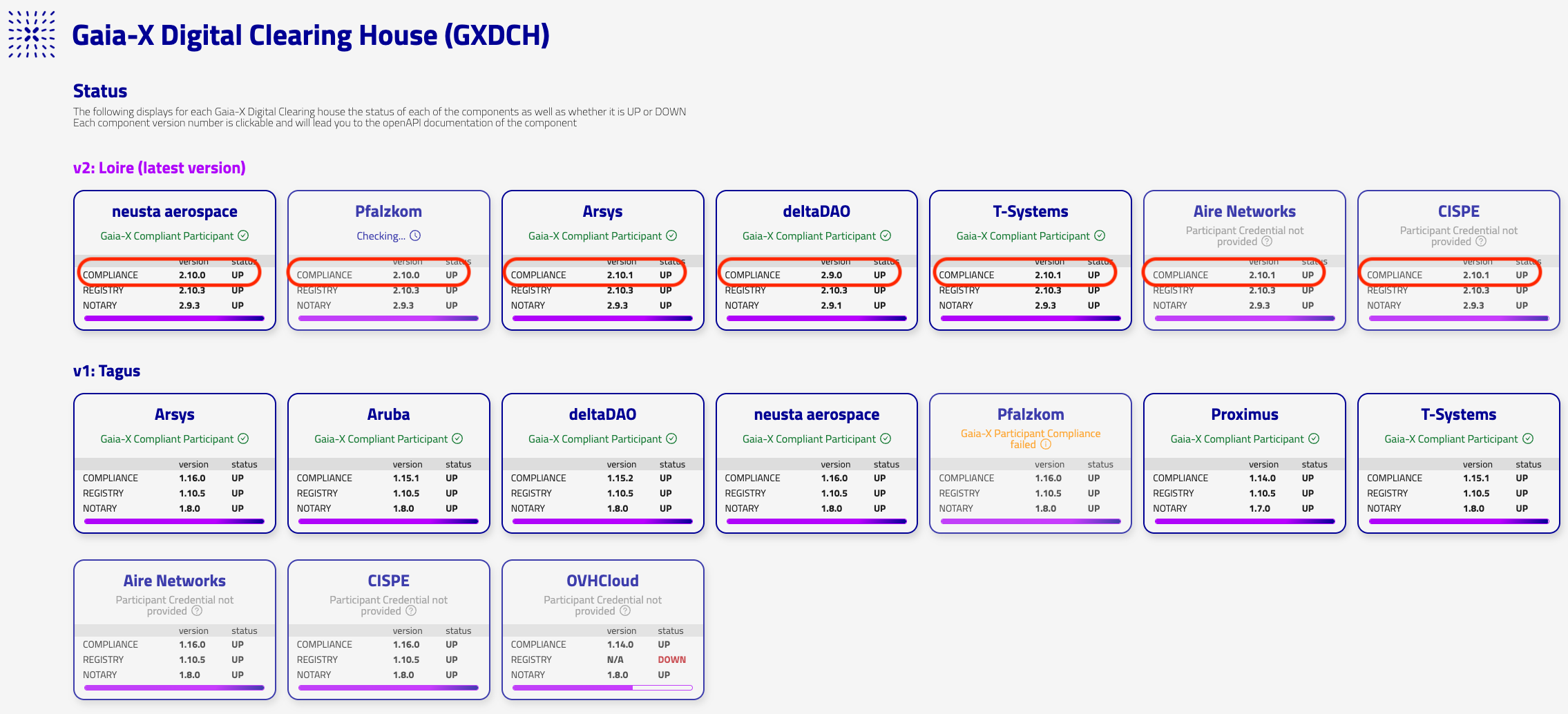 To verify the Gaia-X Participants for compliance with the Gaia-X Loire (v2) standard, you can use any of the available Gaia-X Digital Clearing Houses (GXDCH) v2 "Standard Compliance" endpoints of the respective Compliance Services.