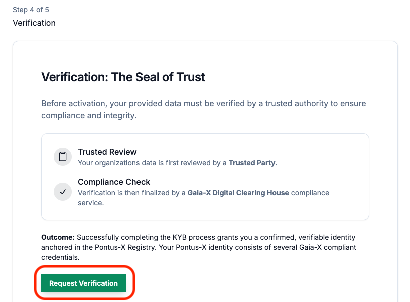 After successfully completing the last step of the Onboarding Walkthrough, the verification of your organizations identity, the onboarding application automatically starts to issue and request the Gaia-X Participant Credentials.