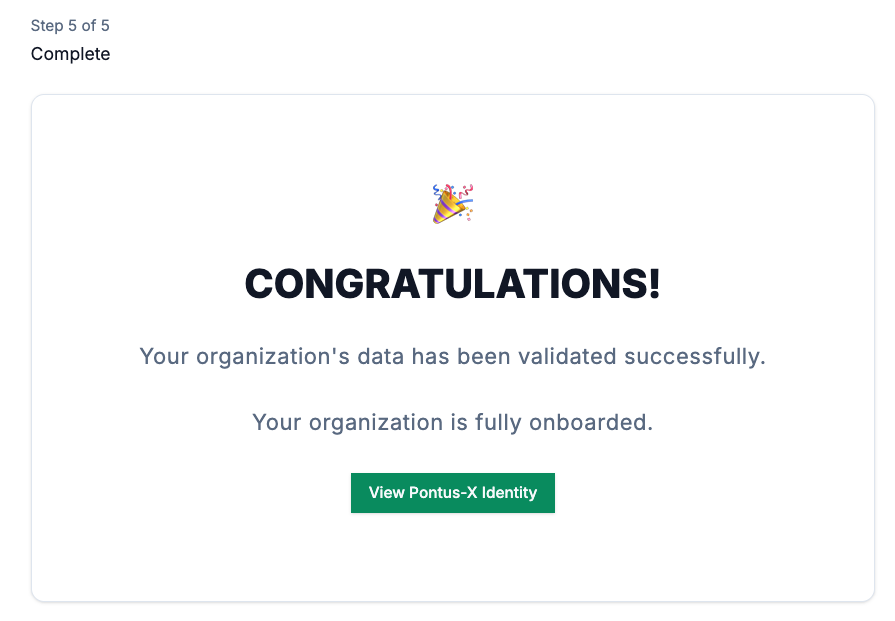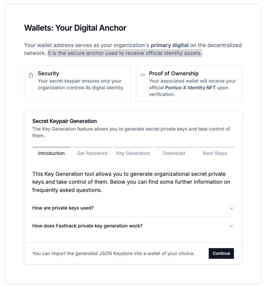 As part of the onboarding process, you will create an organizational secret private key, which will be stored in your wallet/keystore. This key controls your identity in the decentralized Pontus-X AI & data space ecosystem. It is the secure anchor used to receive official identity assets and sign transactions.