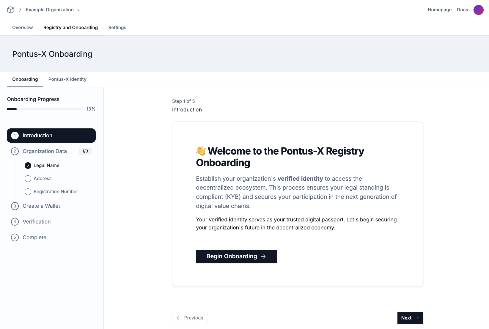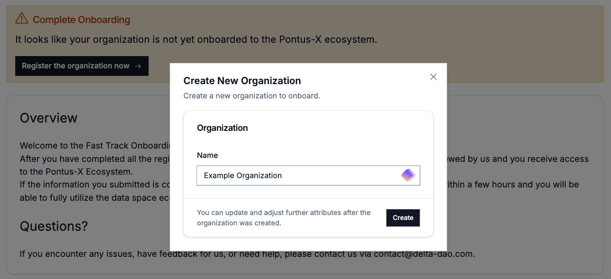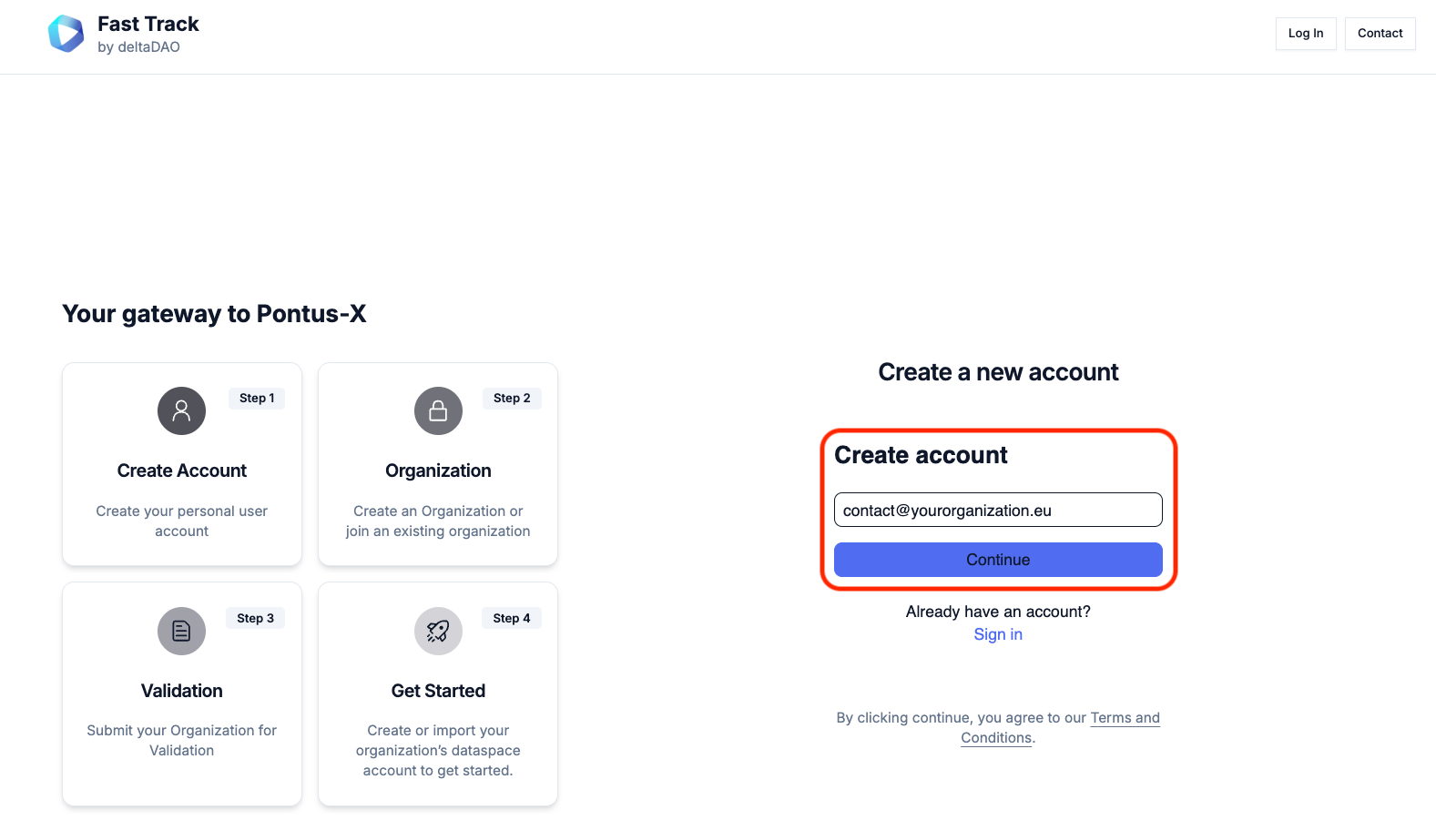 This document will guide you through the entire Pontus-X Onboarding Procedure, from the creation of your organizational account to the usage of the Pontus-X data space ecosystem and receiving your Gaia-X Participant Credentials.
