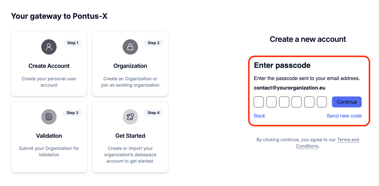 You will be forwarded to the "Create a new account" page and prompted to enter an organizational e-mail address. Please make sure to not use a personal e-mail address and that the email address uses your organization's domain, i.e., @yourorganization.eu, as the domain will be used for validation. By clicking "Continue", you agree to the Terms and Conditions of the Onboarding Application.