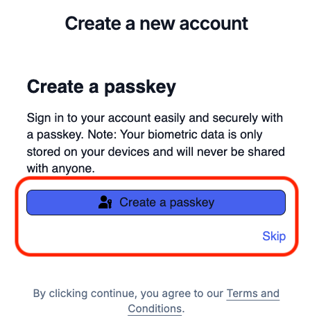 Optional step: After the submission of the passcode you can select to create a passkey for future logins. This passkey will then be stored in your preferred passkey solution on your device. You can also select to skip this step and come back to it at a later point in time by clicking "skip".