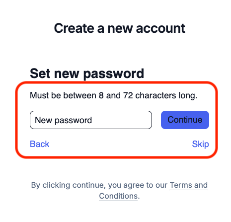 Optional: If you skip creating a passkey, you will be prompted to create a password to protect your account. You can select a password or skip this step. In this case, the default login method will be a passcode sent to you by email when you log back into the application. As with the passkey, you can set the password at a later stage.