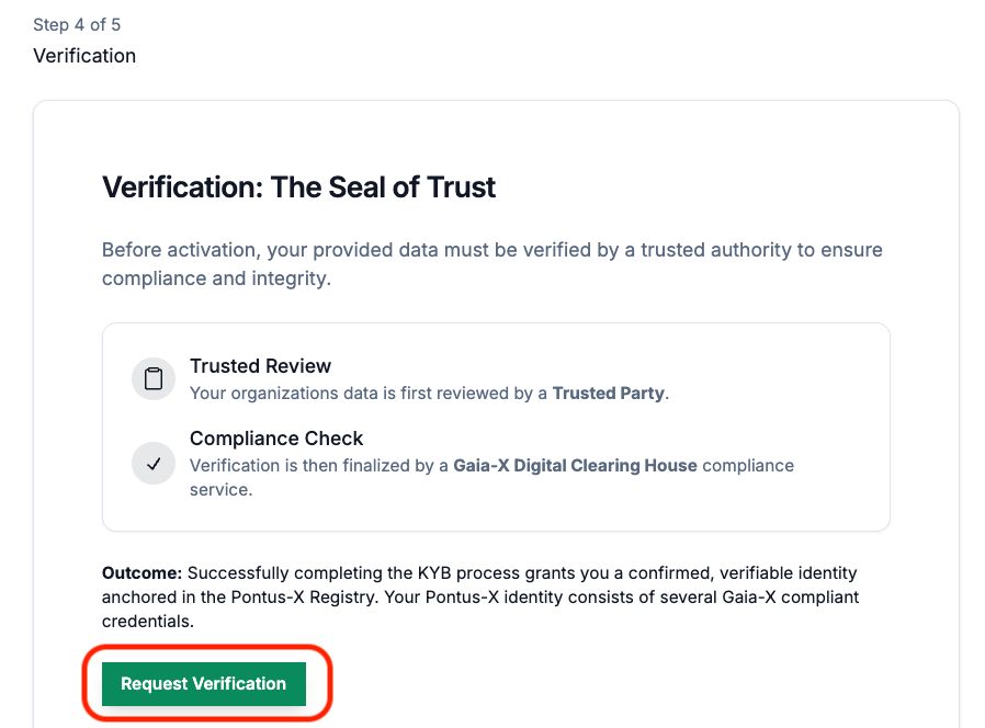 Before your account is registred in the data space ecosystem and your Gaia-X Digital ID is issued, the onboarding application provider will validate your onboarding request and verify your identity. The data provided will also be checked against the Gaia-X Digitial Clearing House (GXDCH) as part of the Gaia-X Participant Credential generation process. This process is widely known as Know-your-Business(KYB) or Know-your-Customer(KYC) procedure. You can submit your request for verification by clicking the green "Request Verification" button.