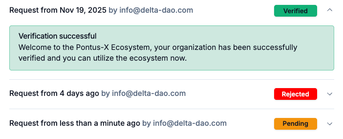 Once you have submitted your verification request, the onboarding application provider will compare your data against trusted national and international sources and inform you of the outcome. The status of your request is indicated in yellow for "Pending", green for "Verified", or red for "Rejected". The process usually takes about 24 hours, depending on the time and date when the request has been submitted. As long as the request is marked as 'Pending', there is nothing you need to do except wait for the procedure to finish. If the result is negative, you can expand the status field to find out why the request has been rejected. You will most likely be informed of the reason by the onboarding application provider. If the verification is successful, you have completed the process and you can proceed to the Pontus-X Ecosystem Portal to engage with the data space.