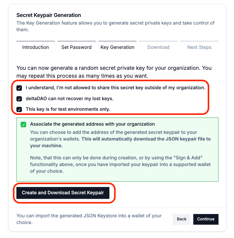 To generate your secret private key and the associated wallet file containing your key, please click "Create and Download Secret Keypair". Please confirm that the wallet file (JSON) has been downloaded correctly and create a secure backup of the file immediatly. This file can be shared with authorized employees of your organization. The wallet file can not be downloaded again from the application. The onboarding app provider never has access to your keys or stores your keys which are generated locally in your browser.