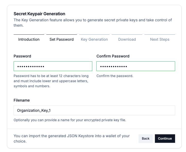 To protect your secret private key, select a secure password with a length of at least 12 characters including lower- and uppercase letters, symbols, and numbers. Please confirm this password and the user interface will indicate that the password has been entered correctly twice by a green border. Optional: You can also specifiy a filename for the key storage file that will be created in the progress. If you leave the field empty a filename will be generated automatically. Only filenames with letters, numbers, "_" and "-" are allowed.