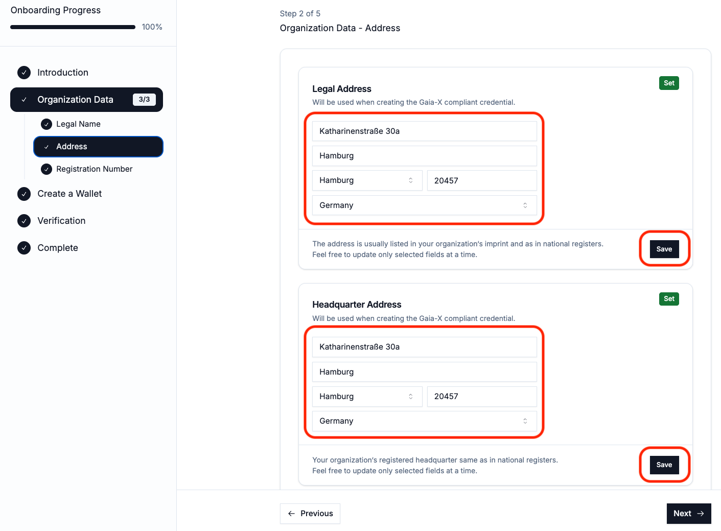 Please fill out the Legal Address and the Headquarter Address of your organization, precisely matching the data in your national register. This data is used to perform the validation of your organizational identity and for the creation of your Digital ID in the form of Gaia-X Participant Credentials following the Gaia-X Ontology. After filling the required fields, please make sure to save the data with the "Save" button.