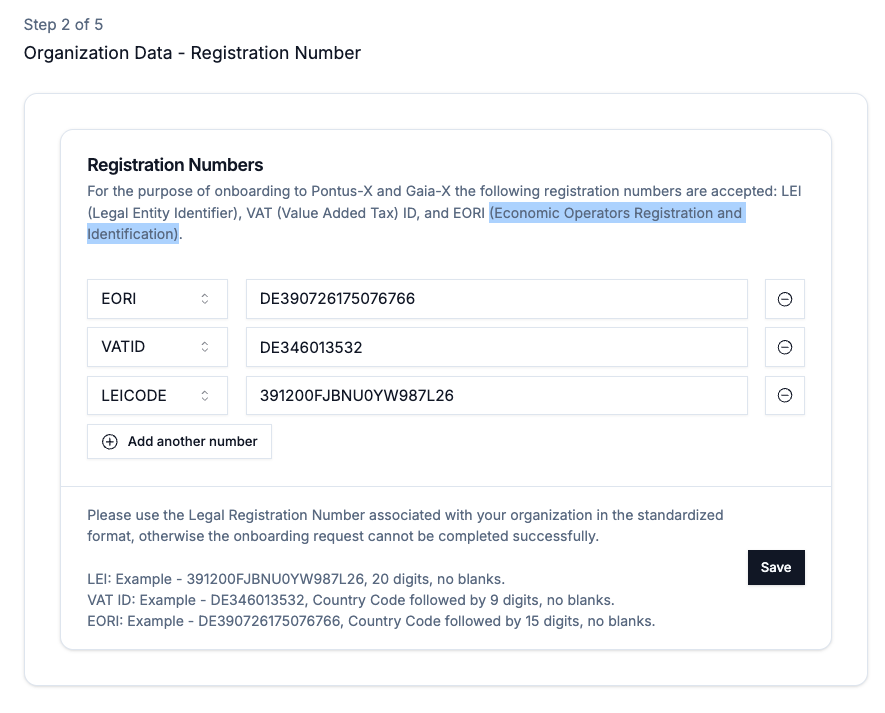 Once you did enter the required information (at least one valid legal registration number) please save the data with the "Save" button. After that you will be forwarded to the wallet creation.